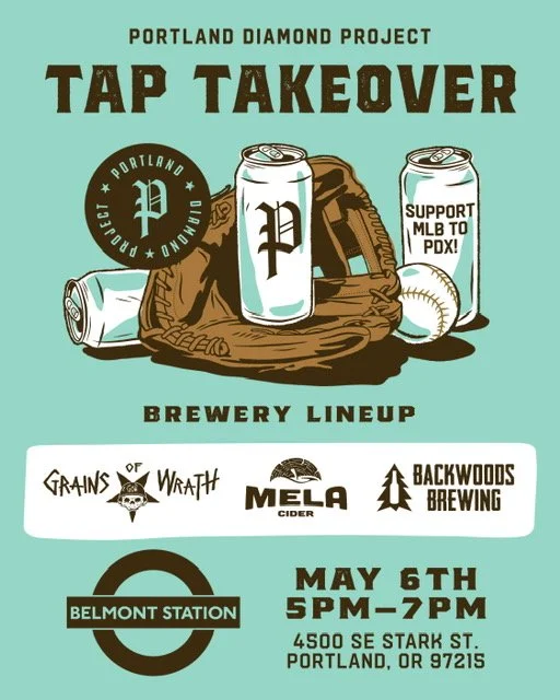 Alongside Grains Of Wrath's amazing draft line up, two other participating companies will be in house tasting out their cans that also benefit MLB PDX. Backwoods and Mela Cider. Backwoods is bringing Portland Diamond Project Pale Ale and Mela Cider will have Diamond Berry Cider!